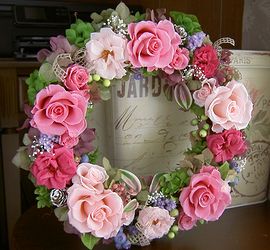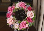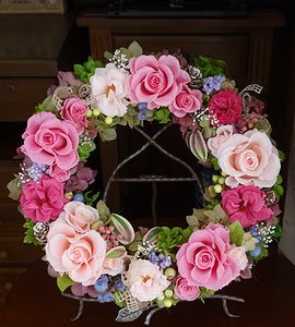 ■商品説明:ボルドーとグリーンの色調が美しいアジサイをリースのベースにしました。濃淡ピンクの薔薇18輪やブルーベリーなどのたくさんの実物もたっぷり取り入れてアレンジしました。洗練されたパリスタイルのリースです。